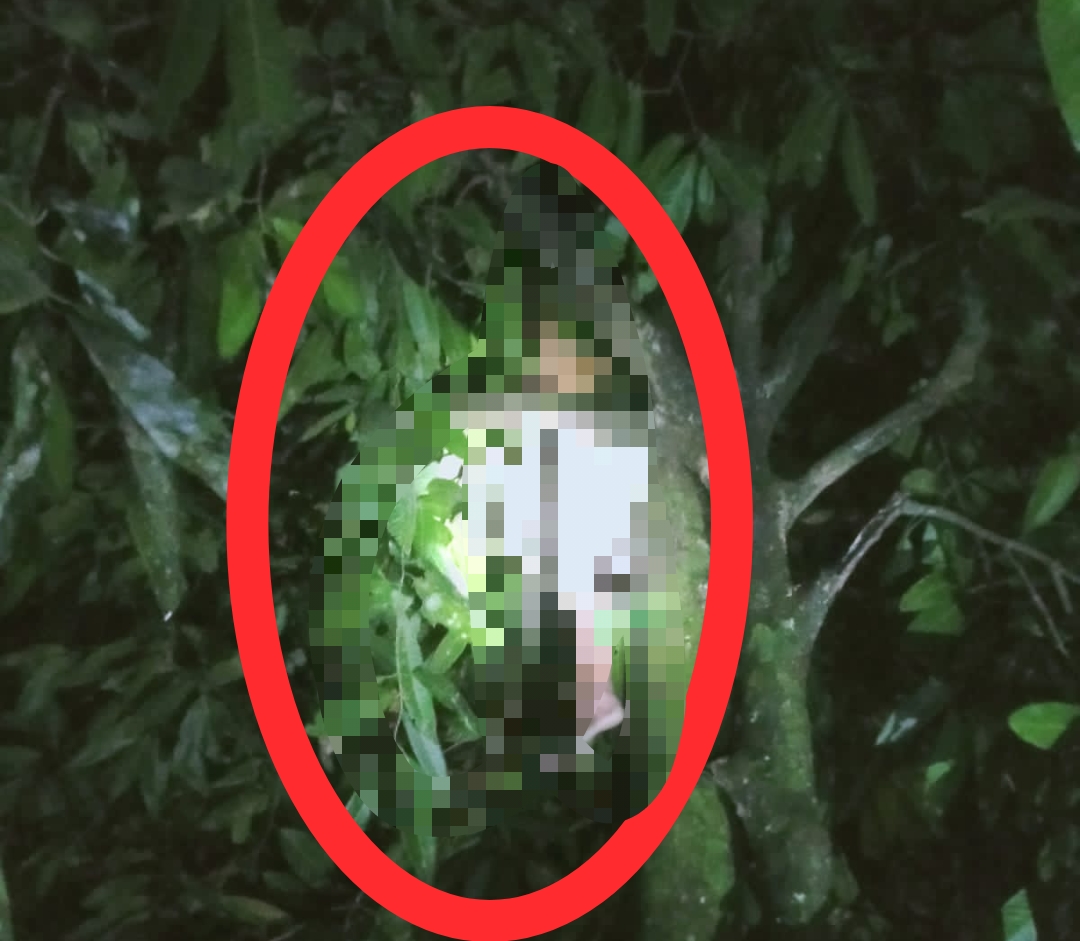 Kondisi pria tersebut tergantung dengan tali mengikat di kepala. Tubuhnya menggantung di atas pohon.