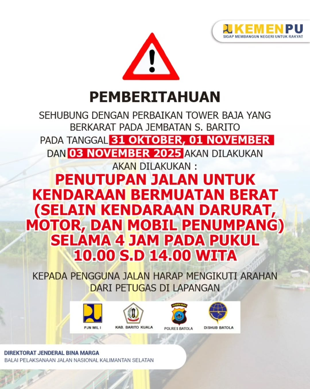 Polres Barito Kuala didampingi PPK 1.1 Prov Kalsel dan Kepala Seksi Pembangunan Jalan dan Jembatan Balai Pelaksanaan Jalan Nasional (BPJN) Kalimantan Selatan, penutupan sementara Jembatan Barito khusus untuk angkutan bermuatan berat.