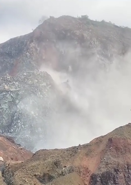 Saat longsor terjadi, tampak batu dan tanah berjatuhan, menimbulkan debu putih tebal di sekitarnya yang menghalangi pandangan mata.