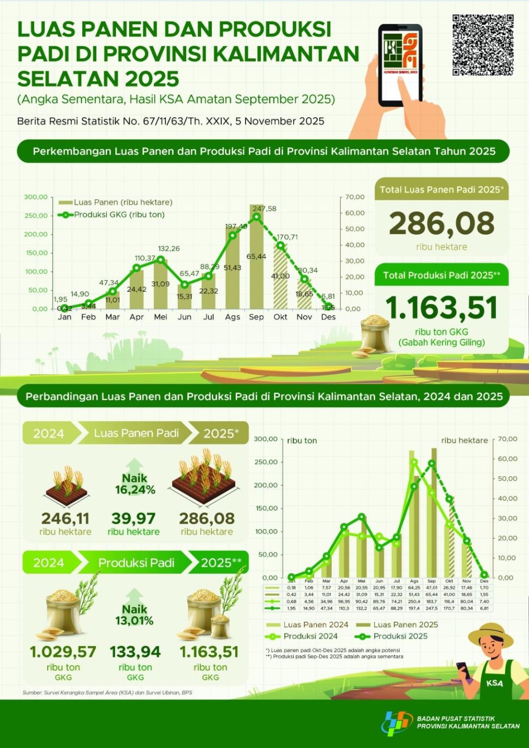 “Realisasi panen padi sepanjang Januari−September 2025 sebesar 224,87 ribu hektare,atau mengalami kenaikan sekitar 24,84 ribu hektare (12,42 persen) dibandingkan Januari− September 2024 yang mencapai 200,04 ribu hektare,” ujar Kepala BPS Kalsel, Mukhamad Mukhanif, Banjarbaru, Rabu (5/11/2025).