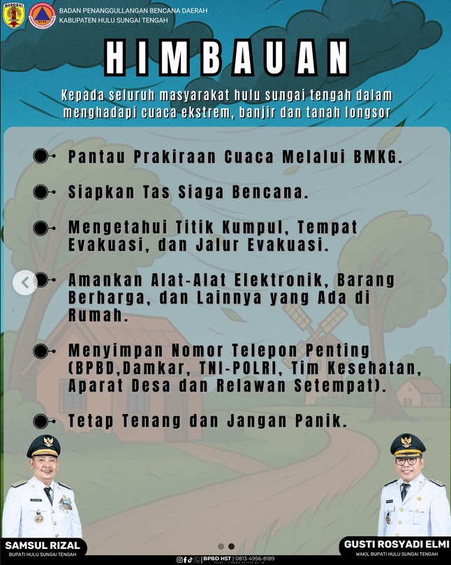 Dikutip Jumat (14/11/2025) dari Instagram BPBD HST, informasi dari BMKG menyebut bahwa kini Indonesia sedang memasuki musim hujan dan cuaca ekstrem, maka BPBD HST mengimbau warga agar: