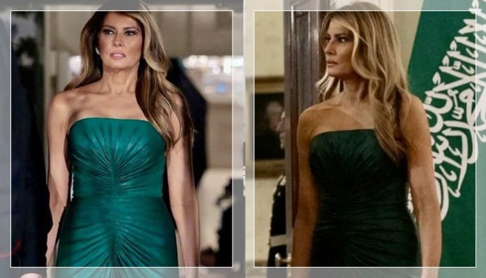 Melania hadir mendampingi Presiden Donald Trump dengan balutan gaun strapless rancangan Elie Saab seharga USD 3.350 atau sekitar Rp 56 juta. Gaun itu sontak mencuri sorotan publik bukan hanya karena tampilannya yang elegan, tetapi juga karena warnanya yang identik dengan bendera Arab Saudi. Hal ini memunculkan spekulasi bahwa sang Ibu Negara memberikan isyarat dukungan simbolis kepada tamu kehormatan tersebut.