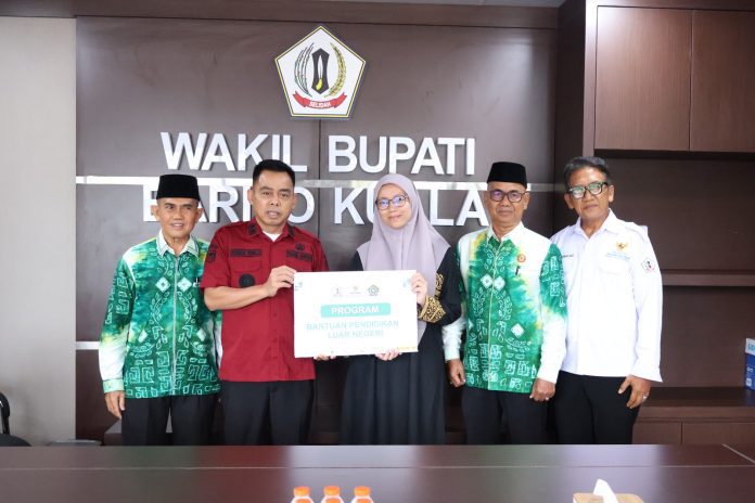 Wakil Bupati Barito Kuala, Herman Susilo, menyerahkan secara simbolis beasiswa kuliah luar negeri kepada dua mahasiswa berprestasi di ruang kerjanya, Kamis (20/11/2025).