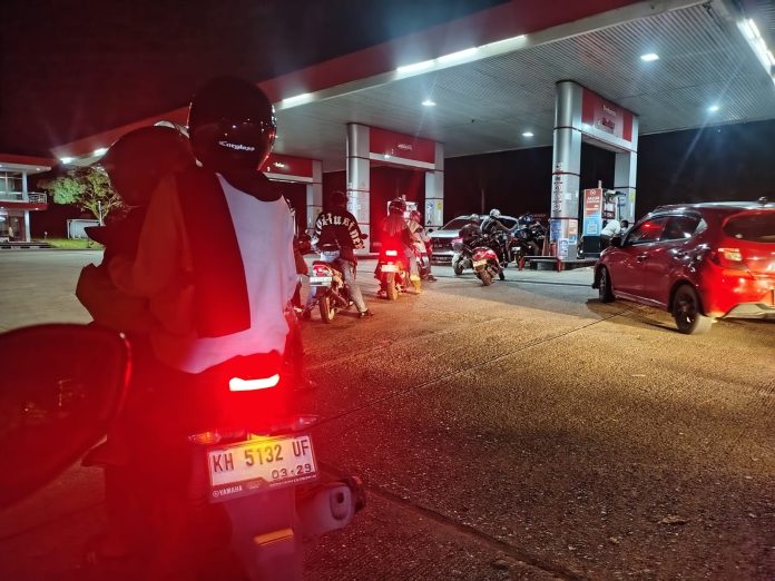 Berdasarkan pantauan di lokasi sekitar pukul 23.00 Wita, pengendara roda dua hingga roda empat terlihat berjejer di tepi jalan menunggu giliran masuk ke area pengisian BBM.