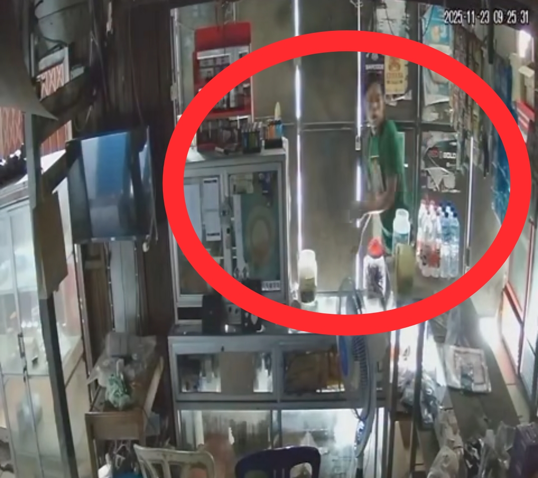 Tampak wajah maling tersebut masuk ke sebuah toko. Ia kemudian menuju ke arah laci di bawah rak rokok.