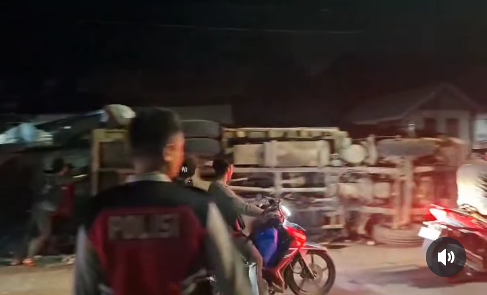 WARTABANJAR.COM, BANJAR – Truk muatan terguling di Jalan PM Noor, Mandiangin, Kecamatan Karang Intan, Kabupaten Banjar, Minggu (23/11/2025) malam.