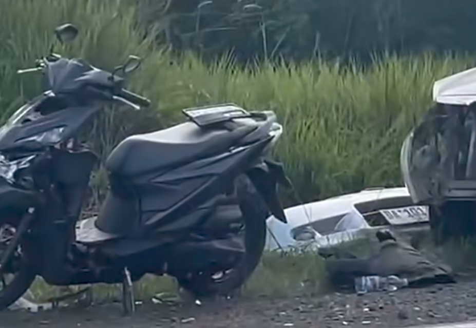 Tabrakan bahkan menyebabkan bemper mobil terlepas dan terpental ke tepi jalan.