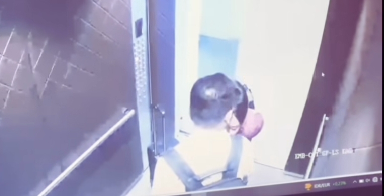 Tampak seorang pramugari berinisial EDL menghampiri sosok pria di sebuah lift dan mendekati hingga mendapatkan ciuman di kening.