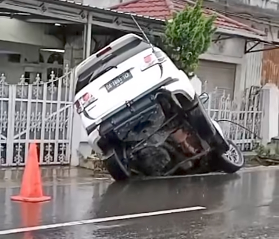 Badan mobil masuk ke drainase di tepi jalan hingga membuat badan mobil terangkat.