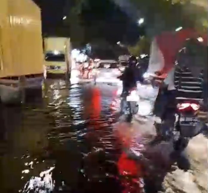 Tampak ketinggian air mencapai betis orang dewasa. Pengendara roda dua dan roda empat terpaksa mengurangi laju kendaraannya.