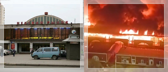Saksi mata melaporkan suara ledakan keras selama proses kebakaran. Rekaman video yang beredar menunjukkan paviliun pasar dilalap api, sementara asap hitam raksasa membubung ke langit St Petersburg.