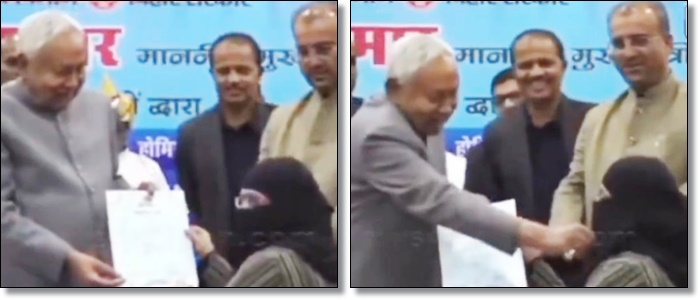 Menurut laporan, dokter Nusrat Parveen, mengenakan jilbab yang menutupi wajahnya, mendekati panggung untuk menerima surat penunjukan sebagai salah satu dari 10 dokter AYUSH yang secara pribadi diberikan surat oleh Kumar. Saat itu, Kepala Menteri berusia 75 tahun itu terlihat terkejut dan dilaporkan bertanya, “Apa ini?” sebelum mengulurkan tangan dari platform dan menarik kerudungnya.