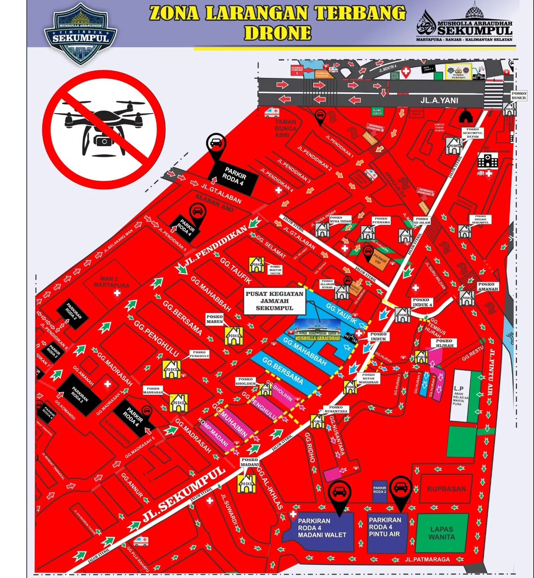 Zona larangan drone ditandai dengan warna merah, antara lain sepanjang area Jalan Pendidikan dan Jalan Sekumpul.