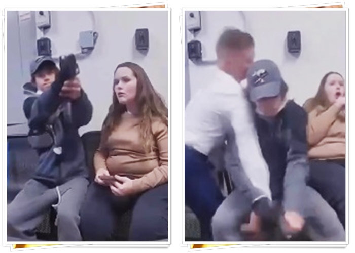 Newman tiba-tiba berbalik badan, mengeluarkan pistol, lalu mengarahkannya ke kepala petugas polisi. Wanita yang bersamanya langsung berteriak panik, “Tidak, tidak, tidak!” Saat pelatuk ditarik, terdengar suara klik—senjata tidak meletus.