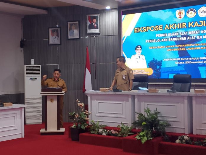 WARTABANJAR.COM, BARABAI – Pemerintah Kabupaten Hulu Sungai Tengah (HST) menegaskan komitmennya terhadap pembangunan infrastruktur yang berkualitas dan berkelanjutan melalui ekspose akhir kajian akademis pengelolaan alat berat konstruksi serta uji material konstruksi. Kegiatan digelar di Auditorium Bupati HST, Selasa (23/12/2025), dan dihadiri pejabat perangkat daerah, narasumber dari Universitas Lambung Mangkurat (ULM), serta pemangku kepentingan bidang pembangunan.