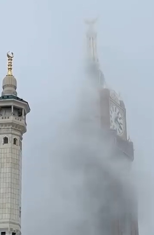 Pengunggah postingan itu menyebut ini momen langka yaitu Menara Zamzam, khususnya di bagian jam di puncaknya diselimuti kabut tebal.