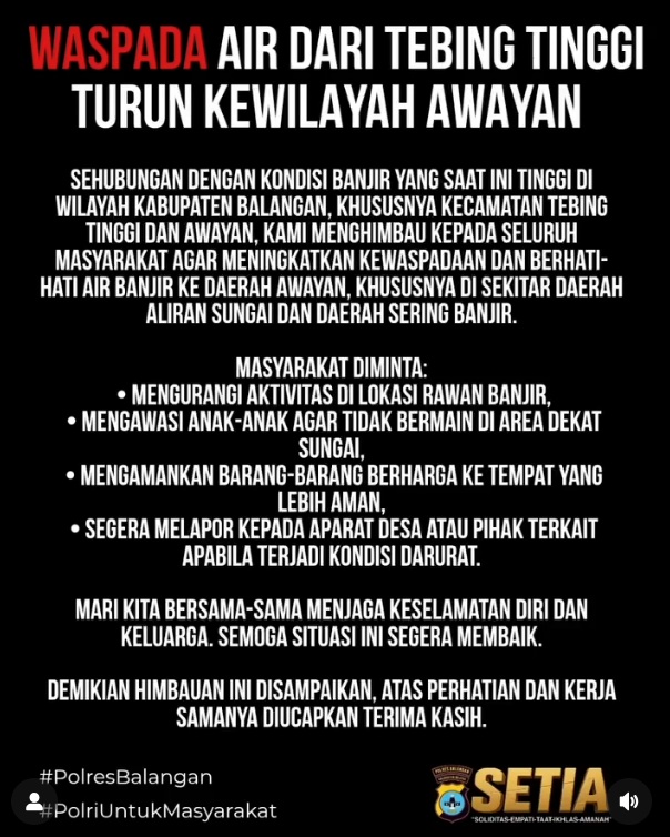 Mengutip Instagram Polres Balangan, diimbau warga agar waspada terhadap air yang turun dari kawasan Tebing Tinggi ke Awayan.