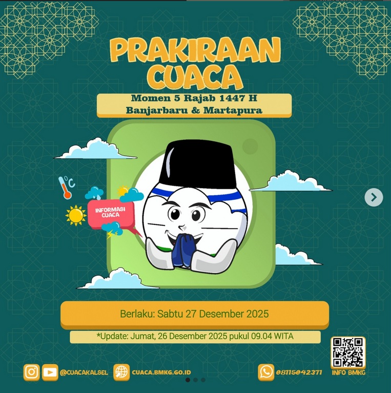 WARTABANJAR.COM, MARTAPURA- Prakiraan cuaca Kalimantan Selatan edisi Momen 5 Rajab 1447 H atau Haul Guru Sekumpul 2025, Sabtu (27/12/2025).