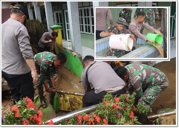 Pantauan di lapangan, personel TNI–Polri tampak bahu-membahu mengeruk lumpur, membersihkan sampah, serta mengangkat sisa material banjir yang menumpuk di dalam dan sekitar bangunan. Upaya ini dilakukan agar fasilitas publik dapat segera difungsikan kembali dan pelayanan masyarakat tidak terganggu terlalu lama.