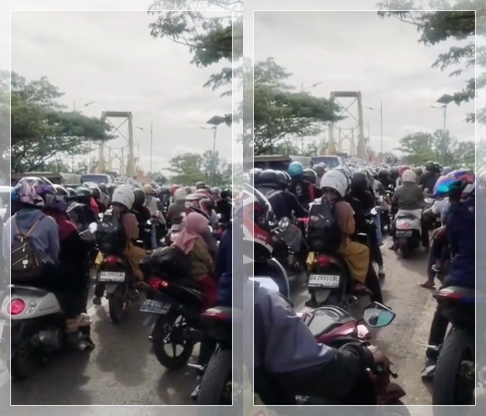 Kondisi tersebut terekam dalam video yang beredar luas di media sosial melalui unggahan akun Instagram @info_kejadian_banjarmasin. Dalam video tampak antrean kendaraan mengular panjang di kedua arah, memadati akses jembatan yang dikenal sebagai jalur utama penghubung antardaerah.