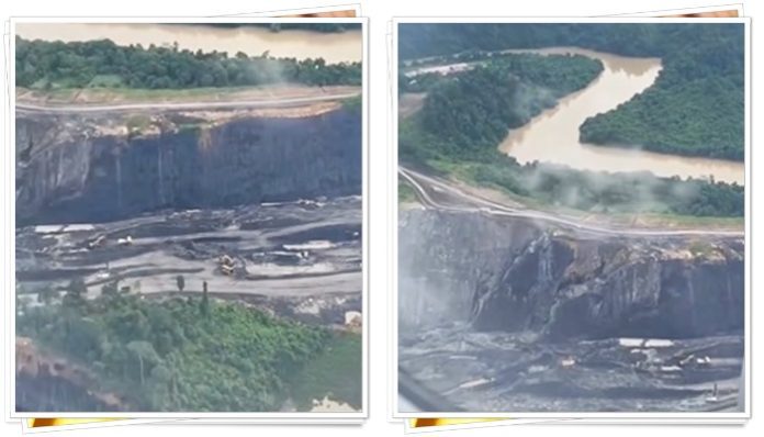 Yang paling mengejutkan, permukaan sungai tampak berada lebih tinggi dibandingkan lubang-lubang tambang yang menganga dalam. Dari sudut pandang udara, situasi tersebut seolah menempatkan kawasan tambang dalam ancaman serius, di mana air sungai berpotensi masuk dan menimbulkan bencana besar jika terjadi longsor atau kegagalan struktur penahan.