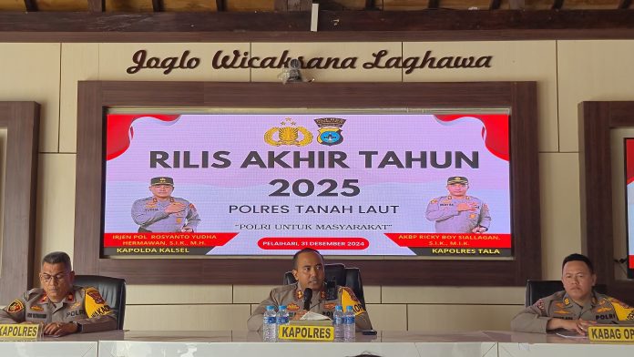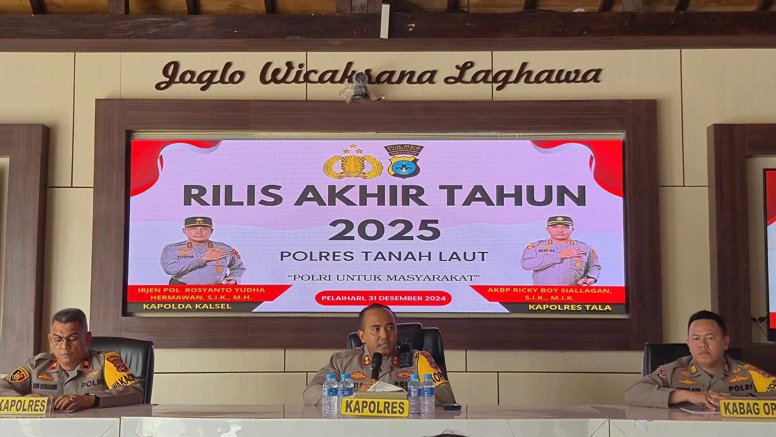 WARTABANJAR.COM, PELAIHARI – Polres Tanah Laut (Tala) menggelar konferensi pers Rilis Akhir Tahun 2025 untuk membedah rapor kinerja kepolisian selama setahun terakhir. Kegiatan yang merangkum data keamanan dan capaian prestasi ini berlangsung di Joglo Wicaksana Laghawa, Rabu (31/12/2025).