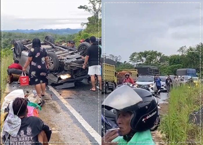 Dalam video yang diunggah akun @beritainformasikal, terlihat sebuah mobil dalam kondisi terbalik di badan jalan. Kendaraan diduga kehilangan kendali akibat melaju dengan kecepatan tinggi saat kondisi jalan licin usai diguyur hujan.