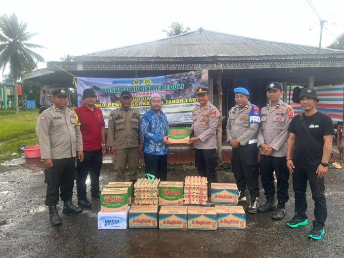 Penyerahan bantuan dilakukan secara simbolis melalui Kapolsek Bati-Bati, Iptu Afiannor, untuk memastikan distribusi kebutuhan pokok bagi warga terdampak berjalan tepat sasaran.
