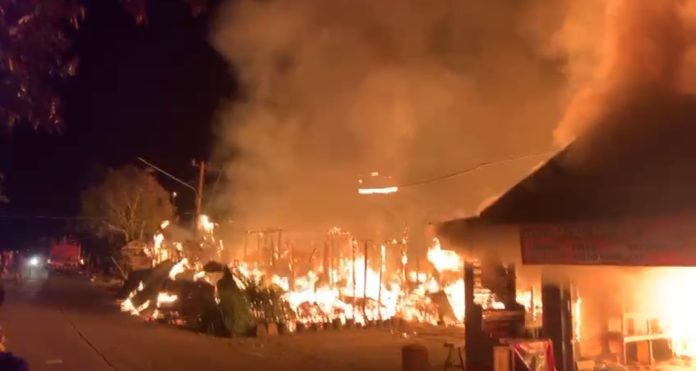 Api yang kian membesar terus merembet ke bangunan lain. Total sementara lima bangunan terbakar.