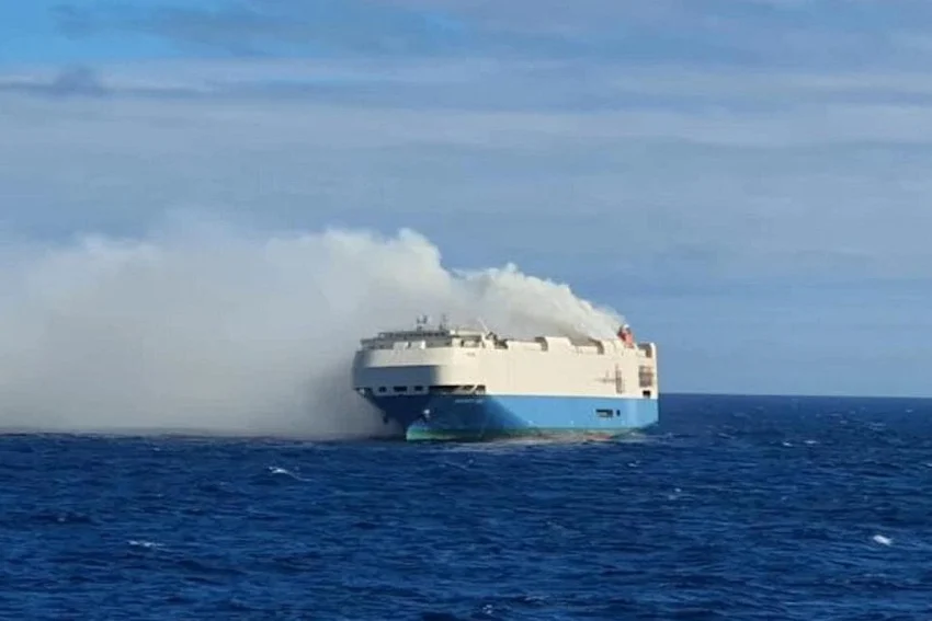 Kapal kargo Felicity Ace tengah berlayar menuju Amerika Serikat membawa ribuan mobil mewah baru dan terbakar.(Wartabanjar.com/Istimewa)