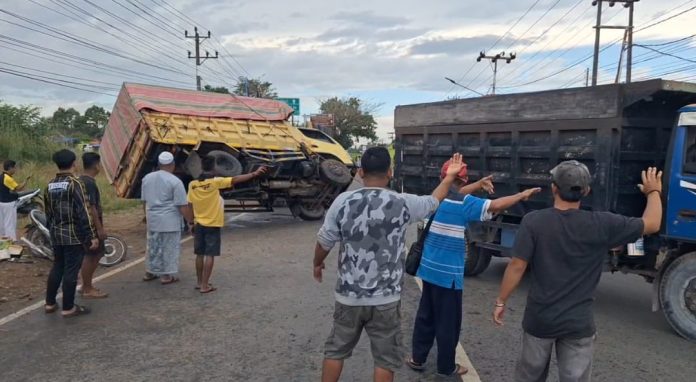 Dump truck tersebut diduga kehilangan kendali saat melintas di turunan jalan, sebelum akhirnya terguling dan menghantam lapak penjual sate yang berada di pinggir jalan.
