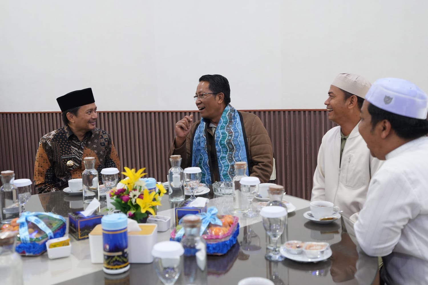 Disambut dengan pengalungan kain sasirangan berwarna biru muda, Supratman Andi tiba sekitar pukul 16.05 WITA dan langsung memasuki ruang translit ditemani beberapa pejabat lainnya.