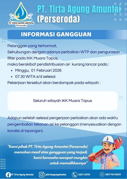 Hal itu dikarenakan ada pencucian WTP dan filter pada IKK Muara Tapus oleh PTAM Tirta Agung Amuntai mulai pukul 07.30 Wita hingga selesai.