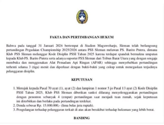 WARTABANJAR.COM – Beredar surat sanksi Komdis PSSI atas PSS Sleman di laga melawan Barito Putera di Stadion Maguwoharjo, Sleman pada Sabtu, 31 Januari 2026 lalu.