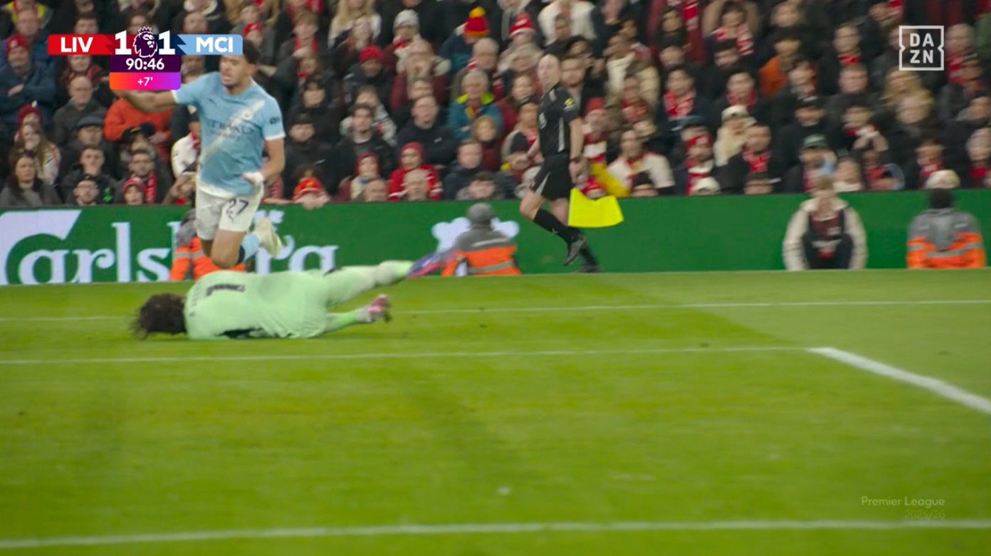 Wasit Craig Pawson mengumumkan pelanggaran menahan oleh Szoboszlai menyebabkan kartu merah serta tendangan bebas untuk Manchester City.