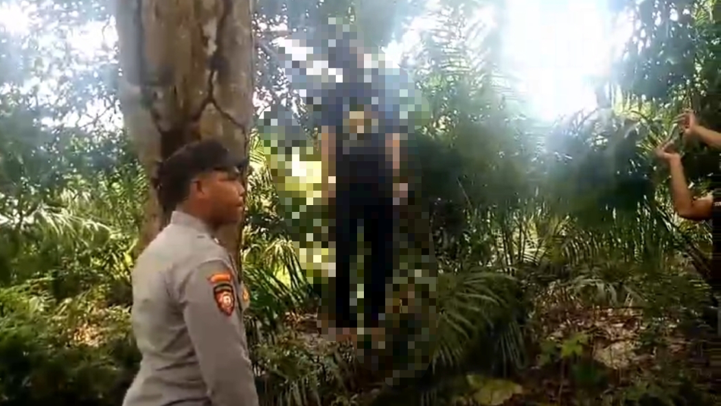 Pihak keluarga dan warga kemudian melakukan pencarian dan menemukan korban tergantung di pohon.