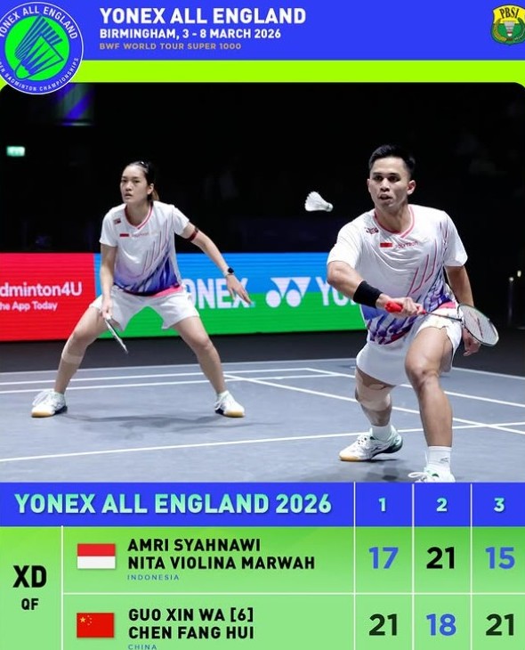 Dalam pertandingan yang berlangsung di Utilita Arena, Birmingham, Inggris, Jumat (6/3/2026), Amri/Nita harus mengakui keunggulan pasangan unggulan tersebut melalui pertarungan tiga gim dengan skor 17-21, 21-18, dan 15-21.