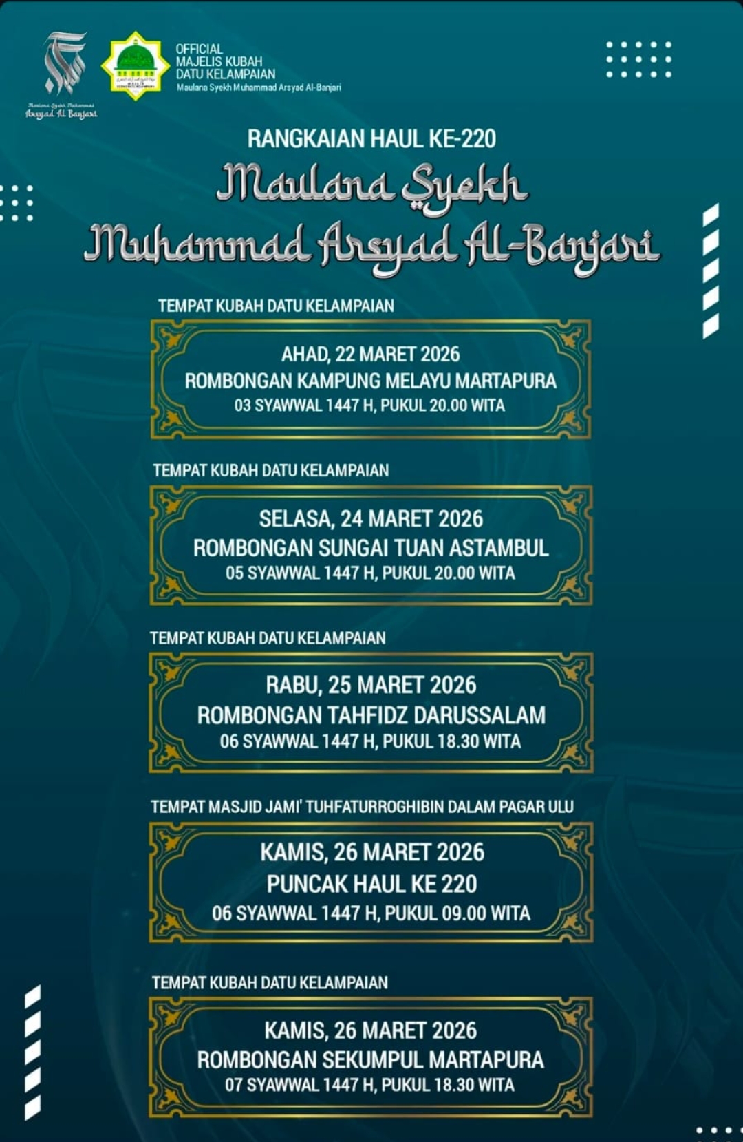 WARTABANJAR.COM – Rangkaian Haul ke-220 Maulana Syekh Muhammad Arsyad Al-Banjari atau Datu Kelampayan telah resmi dirilis.