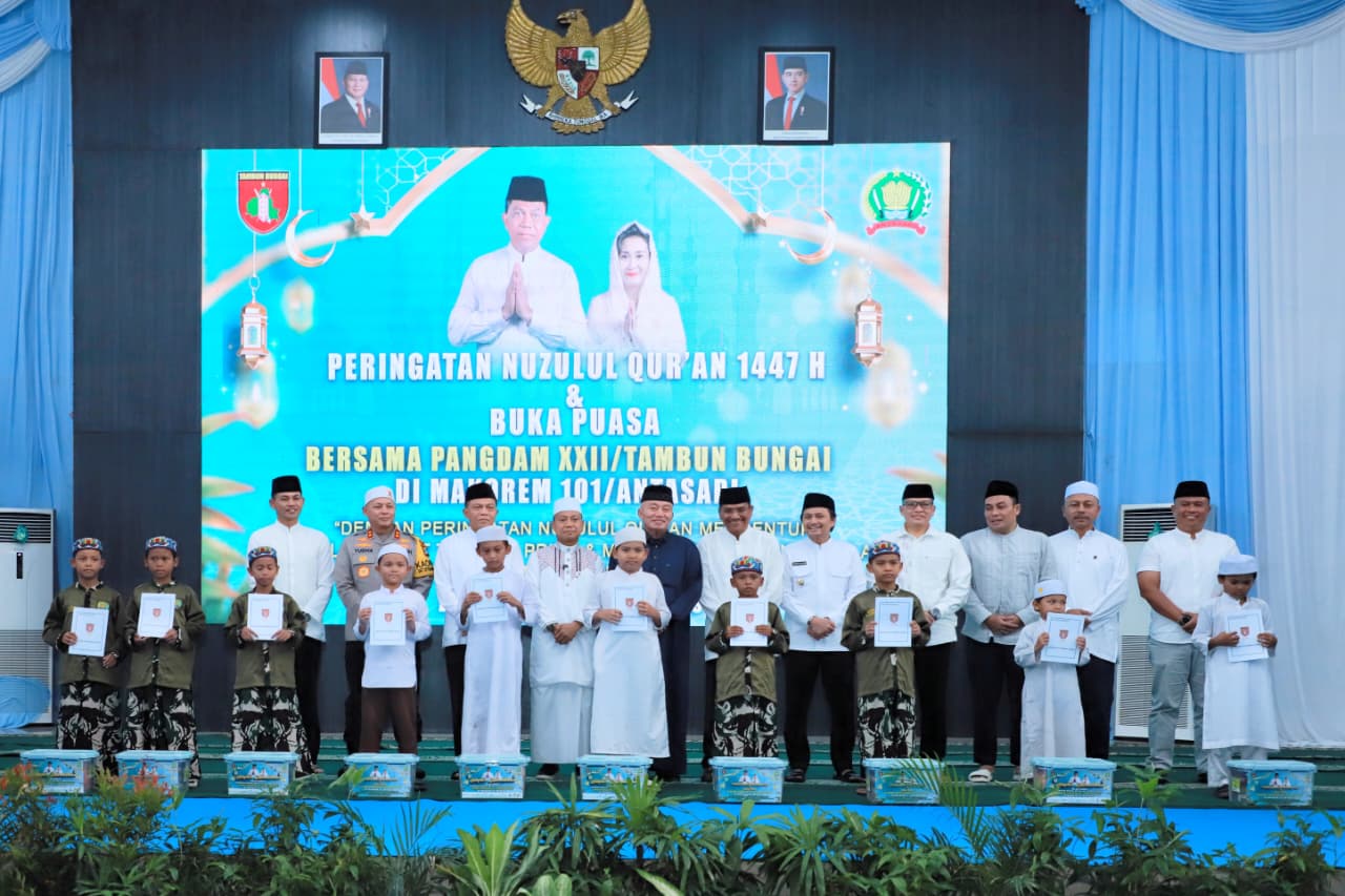 WARTABANJAR.COM, BANJARMASIN- Gubernur Kalsel H. Muhidin bersama Pangdam XXII/Tambun Bungai Zainul Arifin berbuka puasa bersama sekaligus peringati Nuzulul Qur’an 1447 Hijriah di Aula Markas Korem 101/Antasari Banjarmasin pada Sabtu (14/3/2026).