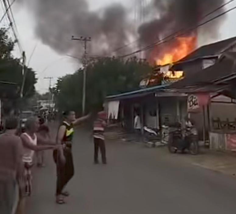 Sebuah rumah terbakar tepat di tepi jalan hingga membuat warga panik dan berhamburan.