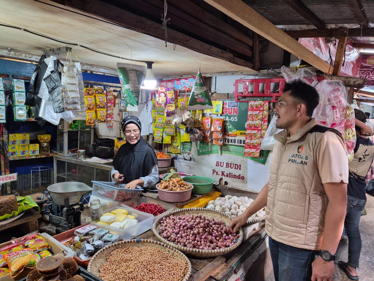 Petugas menyisir sejumlah lapak untuk memastikan harga dan ketersediaan barang kebutuhan pokok penting (bapokting) tetap terkendali.