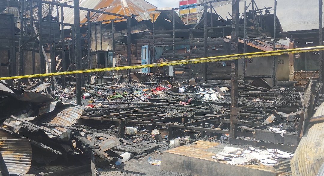 Dari pantauan di lokasi, beberapa bangunan terlihat nyaris rata dengan tanah. Rangka bangunan yang tersisa tampak menghitam, sementara puing-puing material berserakan di sekitar area kejadian.