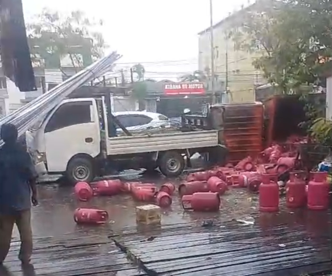 Truk menumpahkan elpiji pink atau elpiji 5 kilogram yang tercecer ke tepi jalan.
