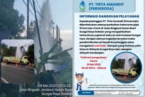 Ada Perawatan Rutin, PTAM Murakata Lestari Matikan Distribusi Air Leding ke Kasarangan HST Pagi iniBerita, Kalsel, Prakiraan Cuaca|Senin, 26 Mei 2025 - 06:02 WIBoleh Yayu FathilalWARTABANJAR.COM, BARABAI-PTAM Murakata Lestari (Perseroda) pagi ini akan melakukan perawatan rutin berupa