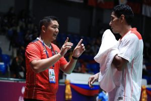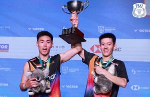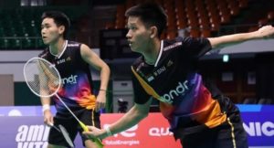 WARTABANJAR.COM, JAKARTA – Pebulutangkis ganda putra Indonesia, Raymond Indra/Nikolaus Joaquin, berselebrasi ‘siu’
