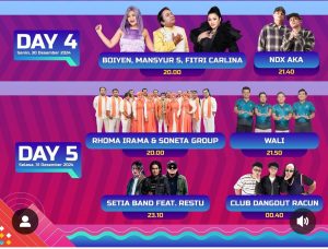 Jam Tampil Setia Band, Rhoma Irama, Wali di Panggung Hiburan Batfest 2024 Malam Tahun Baru 2025Infotainment|Senin, 30 Desember 2024 - 11:15 WIBoleh Yayu FathilalWARTABANJAR.COM, BATULICIN- Memeriahkan malam Tahun Baru 2025, warga Kabupaten Tanah Bumbu, Kalimantan