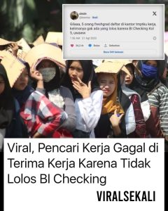 Viral BI Checking Jadi Syarat Pelamar KerjaBerita|Rabu, 7 Februari 2024 - 15:02 WIBRabu, 7 Februari 2024 - 15:11 WIBoleh RestuWARTABANJAR.COM – Cuitan viral terkait syarat pelamar kerja trending di X atau