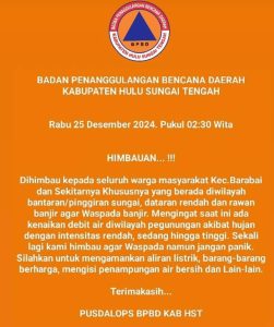 Warga Kabupaten HST Waspada Banjir, BPBD Keluarkan ImbauanBanua Anam, Kalsel|Rabu, 25 Desember 2024 - 13:33 WIBRabu, 25 Desember 2024 - 13:35 WIBoleh RestuWARTABANJAR.COM, HST – Badan Penanggulangan Bencana Daerah (BPBD) Kabupaten Hulu Sungai Tengah