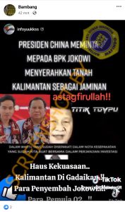 Cek Fakta Pulau Kalimantan Digadaikan ke ChinaBerita|Sabtu, 23 Maret 2024 - 06:48 WIBSabtu, 23 Maret 2024 - 07:28 WIBoleh RestuWARTABANJAR.COM – Unggahan video di akun Facebook mengklaim bahwa demi kekuasaan, Jokowi