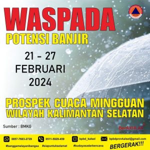 Peringatan Dini Waspada Banjir di Kalsel Hingga 27 FebruariBerita, Prakiraan Cuaca|Minggu, 25 Februari 2024 - 08:43 WIBMinggu, 25 Februari 2024 - 09:38 WIBoleh RestuWARTABANJAR.COM – Peringatan dini waspada banjir masih diberlakukan Badan Penanggulangan Bencana Daerah